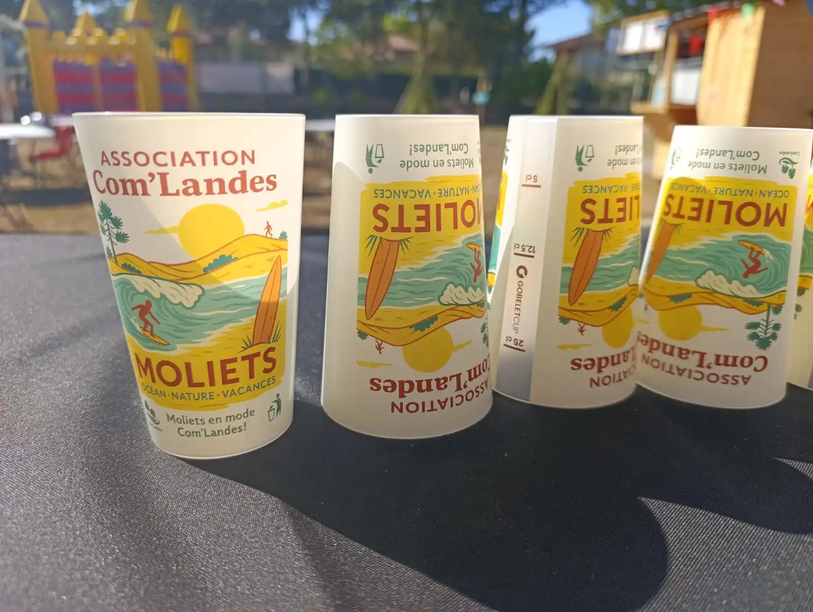 Chaque année, notre équipe imagine un visuel inédit pour habiller le gobelet. L’édition 2025 arbore un motif aux couleurs de Com’Landes, inspiré par l’ambiance estivale, les soirées en plein air et l’esprit convivial qui nous caractérise.
